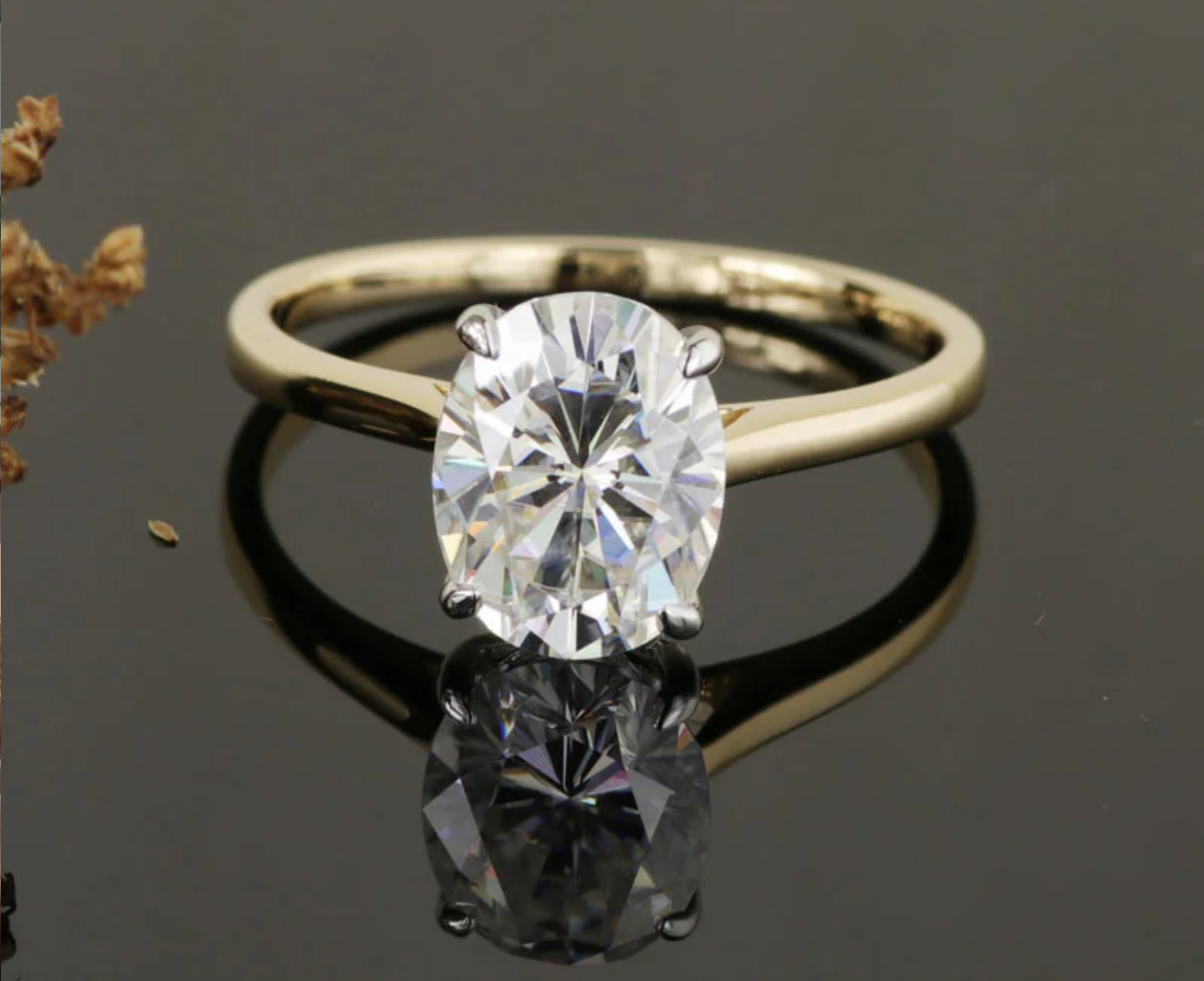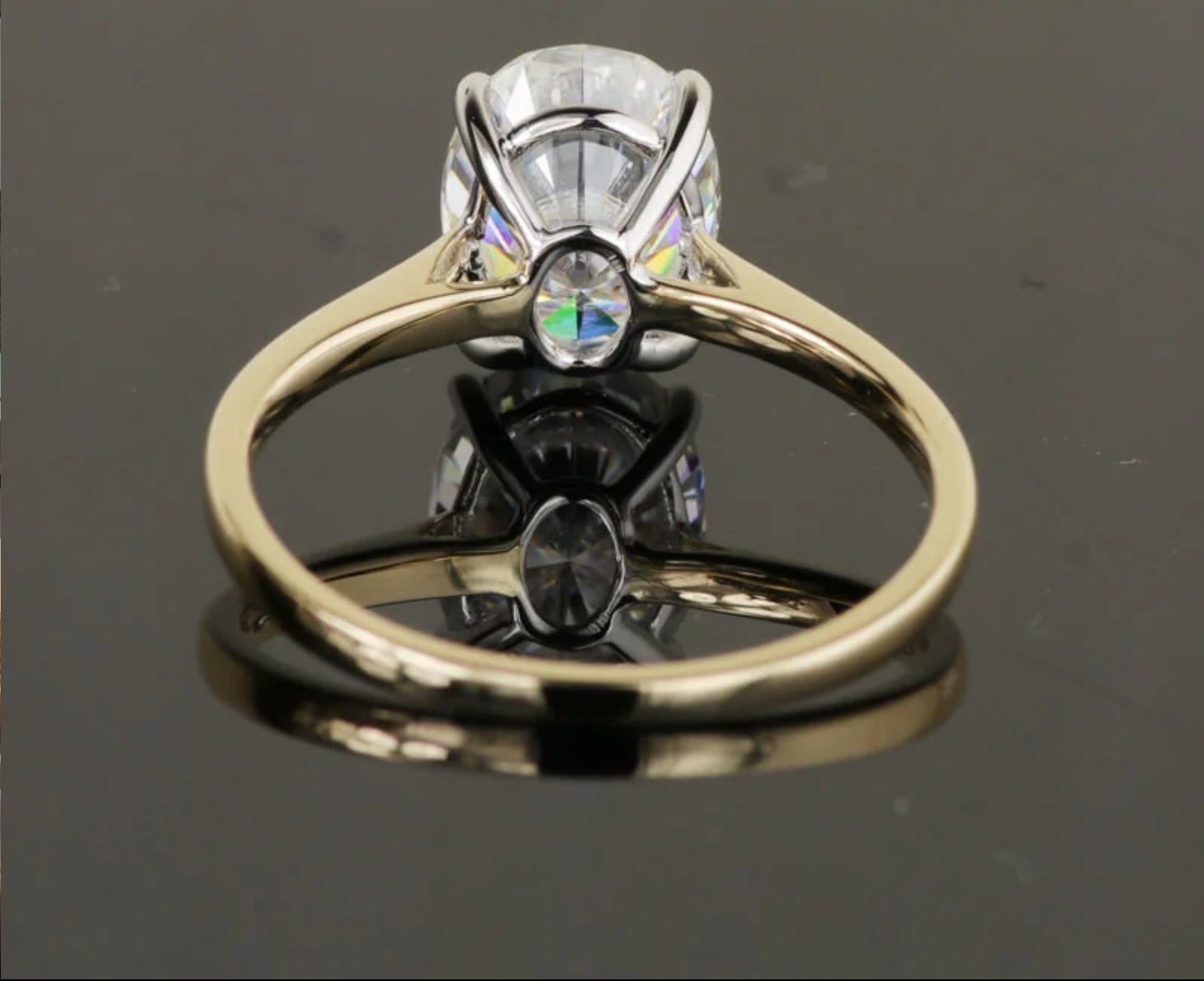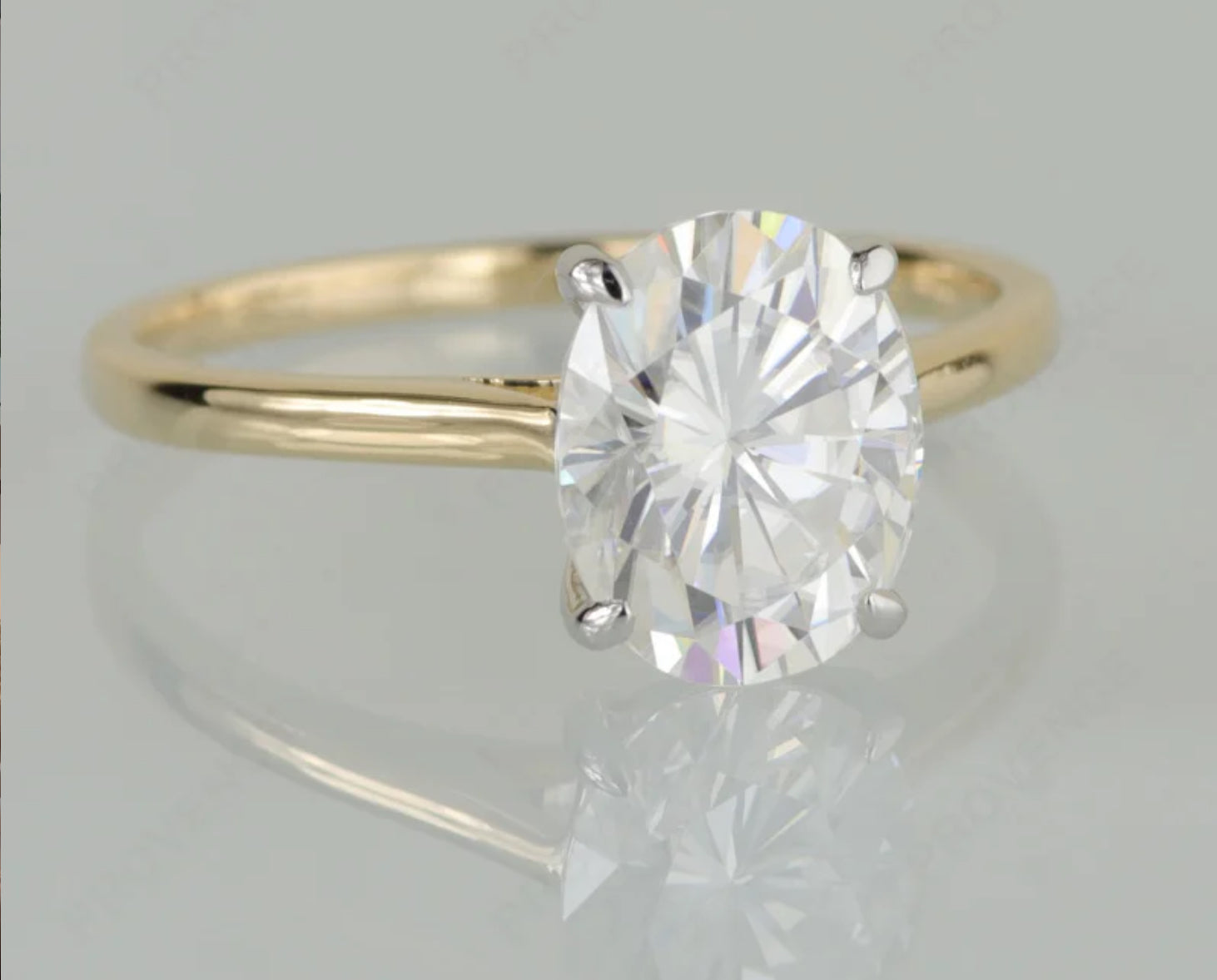 Introducing our stunning 1.5 carat oval moissanite ring, delicately set in a classic 14 karat yellow gold solitaire setting with white gold prongs. This stunning piece captures the timeless beauty of the oval-cut moissanite, radiating elegance and sophistication.