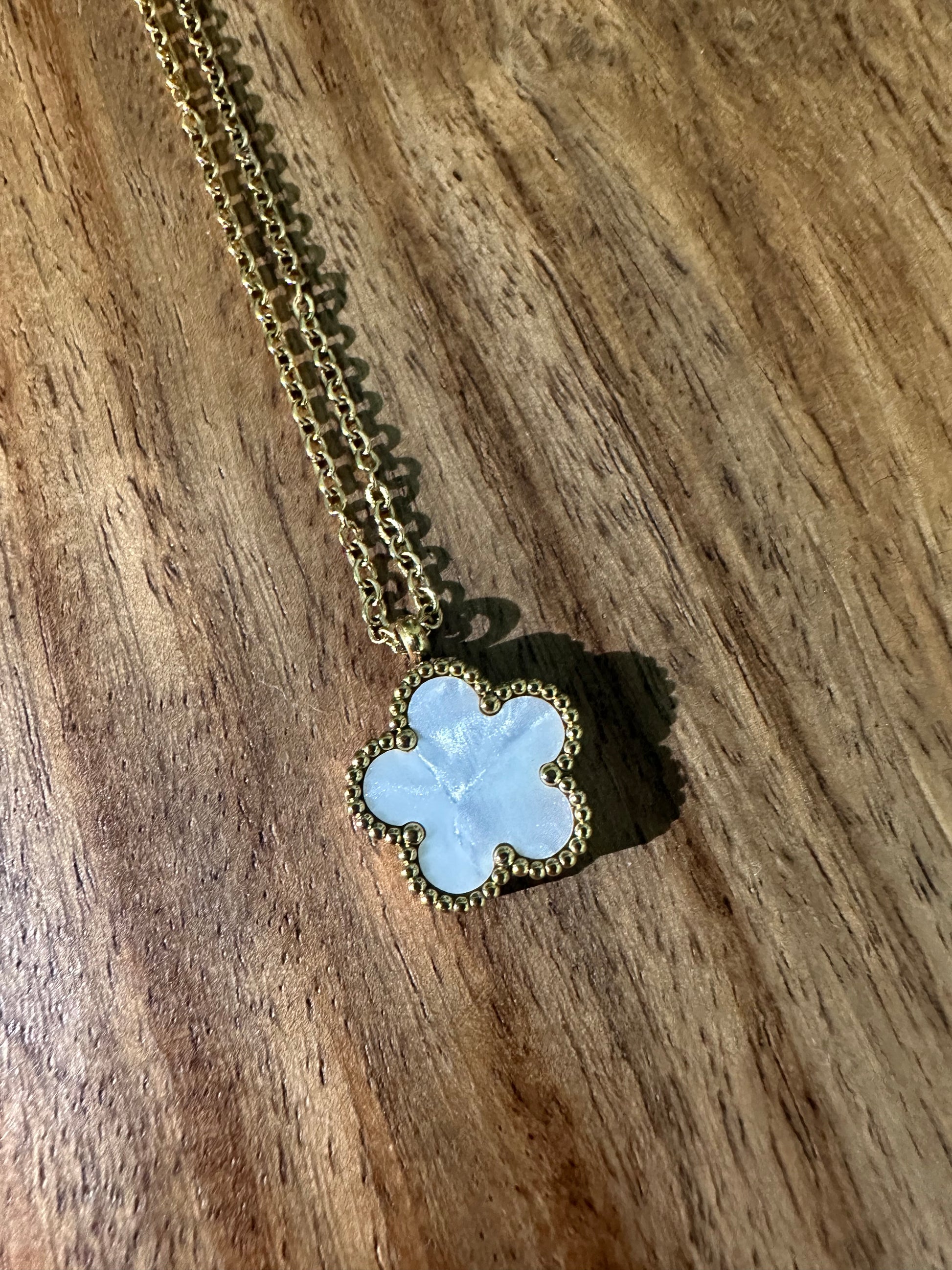 The Cloudy Lock Necklace is a stunning counterpart to the Midnight Lock collection, offering a fresh and elegant touch. Crafted from 18-karat gold-plated stainless steel, this necklace features a single white five-pointed charm that radiates sophistication and versatility. The delicate chain ensures a beautiful drape, making the Cloudy Lock Necklace perfect for layering or wearing solo. Embrace your unique style and create your own luck with this exquisite piece that adds a light, airy feel to any ensemble. Please note these necklaces do have a textured finished.