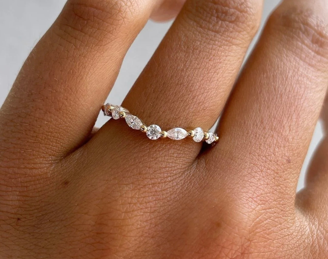 Introducing our exquisite moissanite half eternity band, featuring a dazzling array of 2x4mm marquise-cut and 1.8mm round-cut stones, elegantly set in luxurious 14 karat yellow gold. This stunning piece showcases the timeless beauty and brilliance of moissanite, with each stone meticulously selected and expertly arranged to create a captivating display of sparkle and sophistication. The combination of marquise and round-cut stones adds depth and dimension to the band, making it a truly eye-catching and elegant accessory. Whether worn alone or stacked with other bands, this moissanite half eternity band is the perfect symbol of everlasting love and commitment. Elevate your jewelry collection with this exquisite piece that will be cherished for a lifetime.